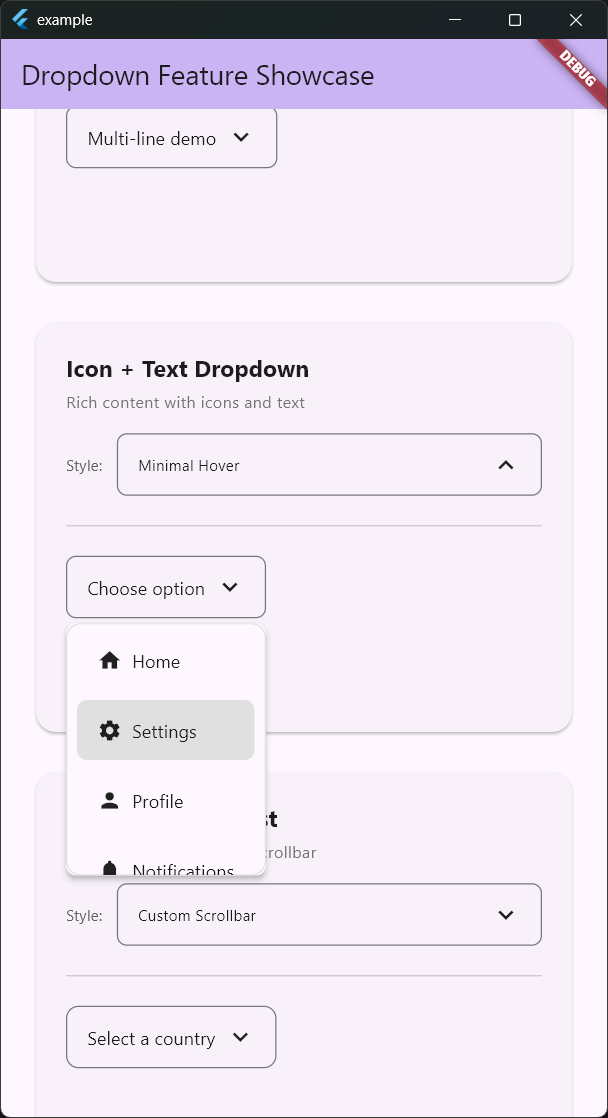 • OverlayEntry-based Architecture: Unlike Flutter's built-in DropdownButton which pushes a new Route via Navigator, this package directly uses OverlayEntry. This enables precise dropdown placement right below/above the button and full control over animations.